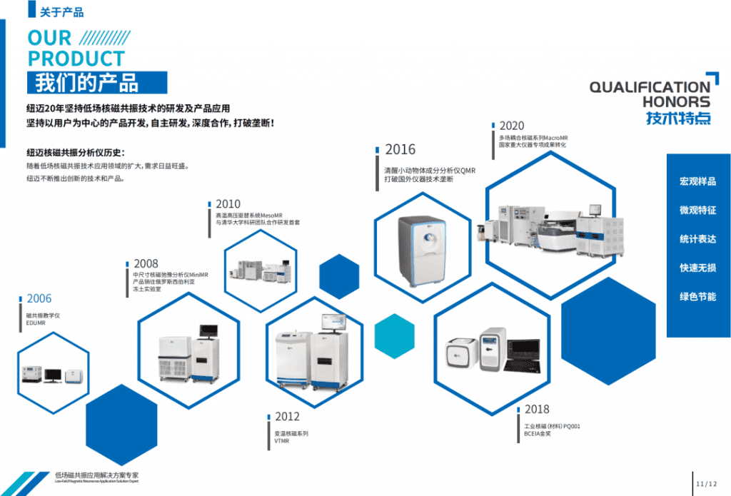 蘇州紐邁分析儀器股份有限公司,自2003年成立以來,一直專注于“核磁共振”技術的開發和應用推廣。作為一家高新技術企業,紐邁分析始終堅持創新驅動發展戰略。先后承擔了國家重大儀器設備專項和江蘇省科技成果轉化專項等各級科技項目,并率先掌握了各項核心技術,陸續開發出多個系列的并具有自主知識產權的專業低場核磁共振設備,目前已廣泛應用于能源勘探、高分子材料、紡織工業、生命科學、農業食品等多個行業領域,填補了國內行業空白,并得到了廣大客戶的一致認可。公司發展強勁,在國內低場核磁細分市場極具競爭力。