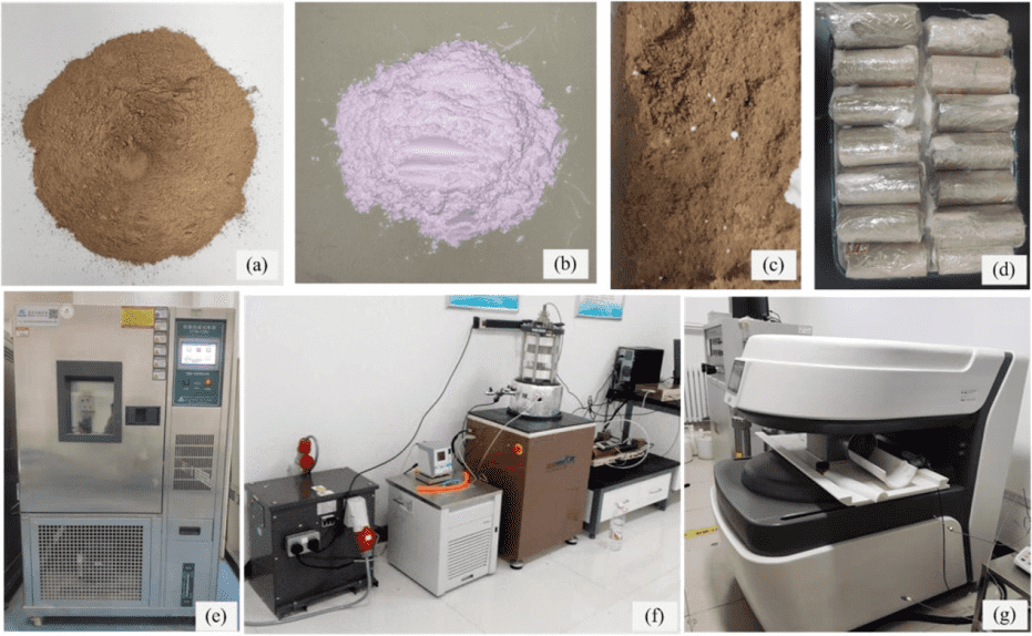 圖1 (a)黃土、(b)納米氧化鎂、(c)NM處理的黃土、(d)測試樣品、(e)凍融室、(f)動態三軸裝置、(g)核磁共振(NMR)分析儀。