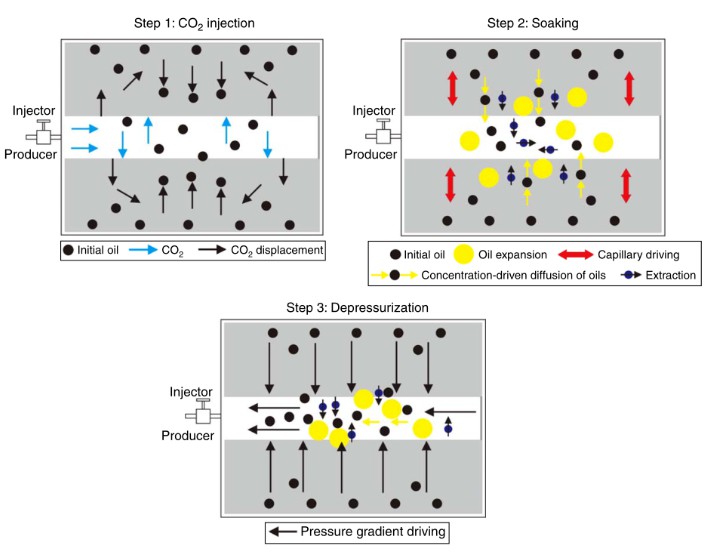 浸泡階段: 在此過程中注入的CO2進一步擴散到巖石基質中,并溶解在基質油中,此時以萃取作用和溶解作用為主,溶解的CO2導致局部高壓,從而將油驅向裂縫。