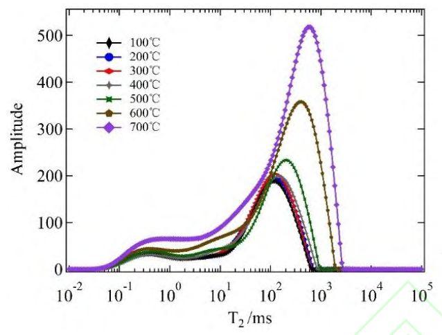 從不同溫度下的T2譜圖中可以看出,T2圖譜表現(xiàn)為雙峰特性,其中較低的峰值范圍主要在10ms以內(nèi),大于10ms以上的孔徑范圍信號幅值偏大,即孔隙主要集中在該范圍內(nèi)。低于400℃以下的圖譜雙峰形態(tài)和走勢一致,譜曲線基本重合,表明加熱溫度低于400℃時(shí),溫度對花崗巖內(nèi)部的微觀結(jié)構(gòu)影響極小。