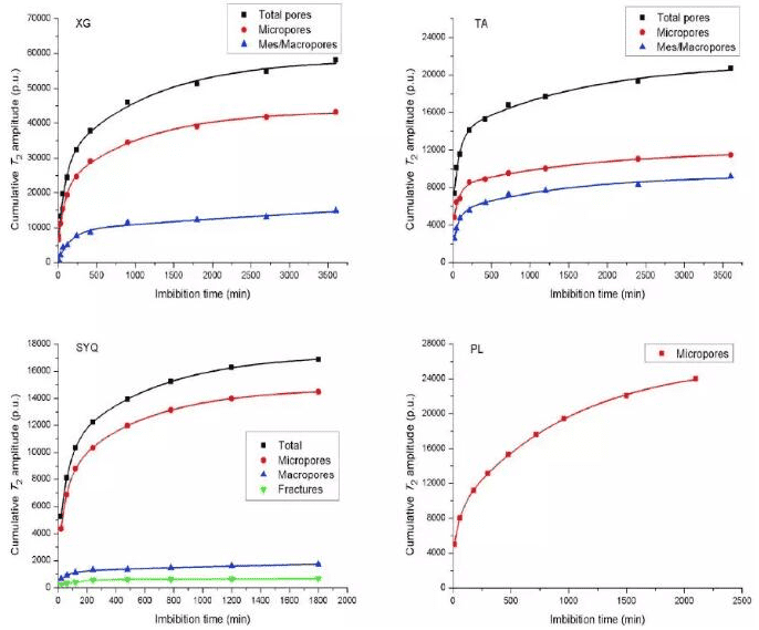 在進行核磁測量時,為了防止核磁線圈放熱造成的水分蒸發(fā),將巖心置于長頸玻璃試管中進行測量。實驗在室溫的環(huán)境下進行,溫度約為26度。煤巖自吸的水的量通過核磁共振T2譜檢測,考慮到自吸速率先快后慢,因此在自吸初期,每10分鐘進行一次測量,在自吸后期,約2小時進行一次測量。
