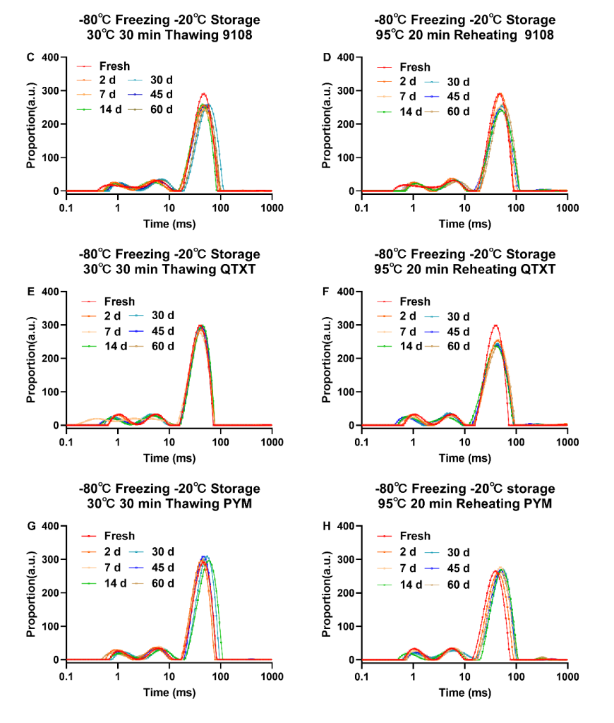 2、水分狀態分析: 使用低場核磁共振(LF-NMR)技術檢測不同凍藏時間點樣品的水分弛豫特性,計算不同狀態水分的比例(特別是自由水含量T22的變化),并通過MRI觀察水分空間分布的均勻性。