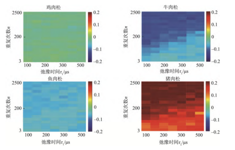 以 4 類純肉松(豬、雞、牛、魚)的二維弛豫數據平均強度為基準,構建 “參考曲面fref(τ1,n)”(曲面函數含多階多項式項,可精準表征純肉松的弛豫特征);將待測樣品的二維弛豫曲面與參考曲面相減,得到反映樣品與純肉松差異的 “τ2分布指紋譜”。