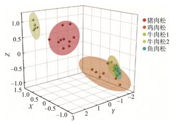 為提升準確性,將二維指紋譜數據整合到三維坐標系(X、Y、Z 分別代表指紋譜的 3 個特征區域),并構建置信度 60% 的 “置信橢球”:不同種類肉松的數據點在三維坐標系中呈特定分布(如豬肉松集中于上部左側、雞肉松集中于下部右側),且混合肉松的數據點會沿 “純肉松 – 純肉松” 的線性路徑分布(如豬雞混合肉松的線性擬合決定系數(R2=0.97186),可通過數據點位置進一步驗證種類及摻假比例,確保檢測精確性。