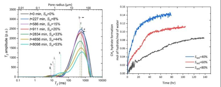 1、MH生成導(dǎo)致孔隙被固體MH填充,殘余水遷移到相對較大的孔隙和孔隙大小分布較窄的孔隙中心。從T2譜的右移可以看出,在泥砂中生成MH的過程中,孔隙中自由水的比表面積(表面積與體積之比)持續(xù)下降。
