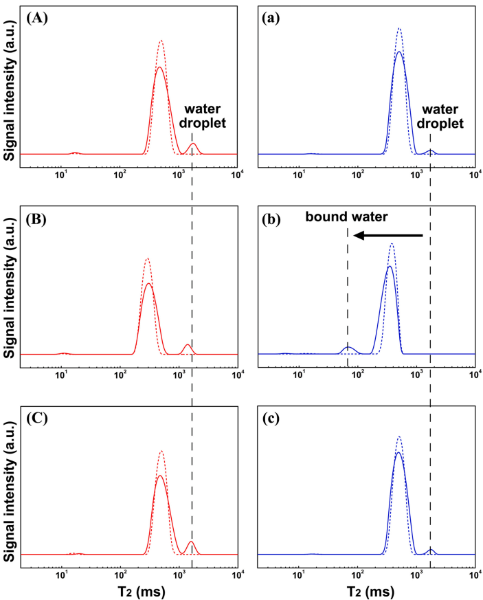 實驗中制備了三種體系,為油包鹽水乳液,向油包鹽水乳液中分別加入親水顆粒BaSO?和疏水顆粒PTFE,觀察體系中水的弛豫時間分布,通過對比超聲前后水弛豫時間的變化,說明油相中水的存在形式。T2弛豫時間分布:超聲前(A)油包鹽水乳液,向油包鹽水乳液加入(B)親水顆粒BaSO4和(C)疏水顆PTFE。(a–c)為(A–C)對應超聲后的體系。顆粒的體積分數為20%。
